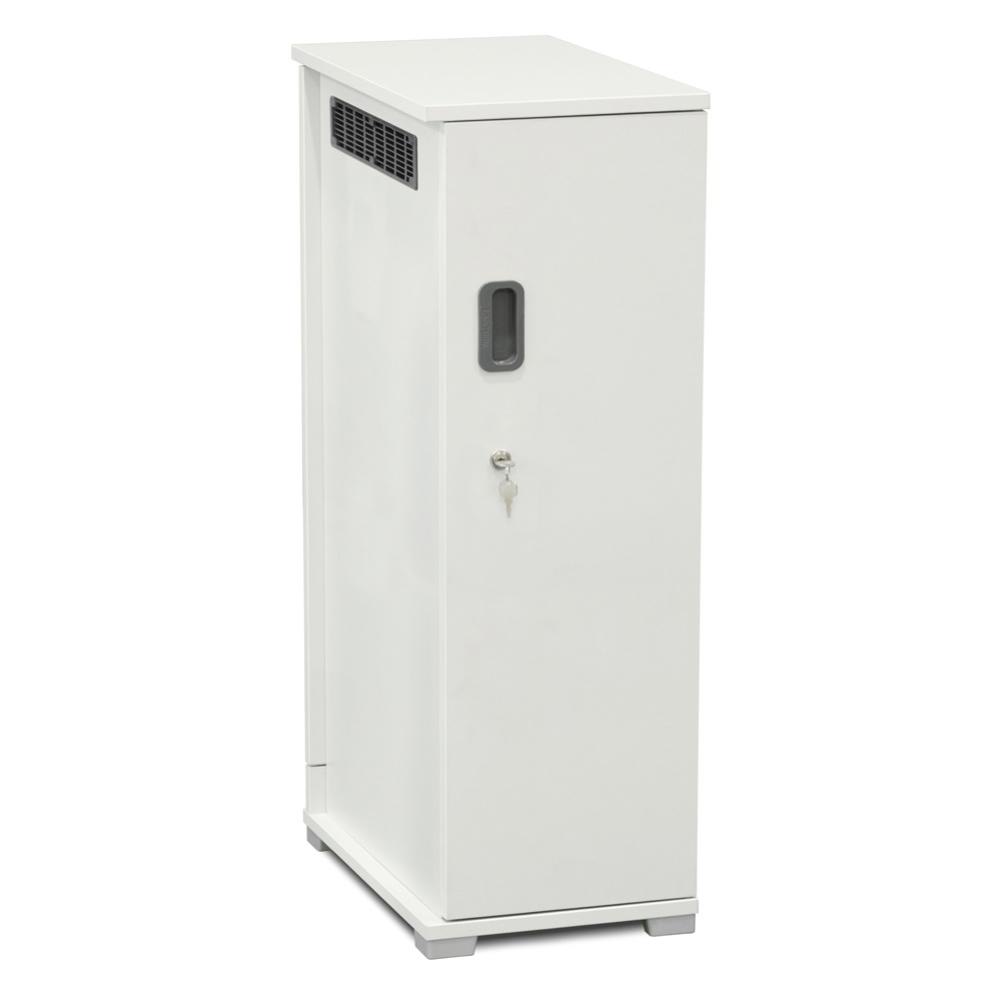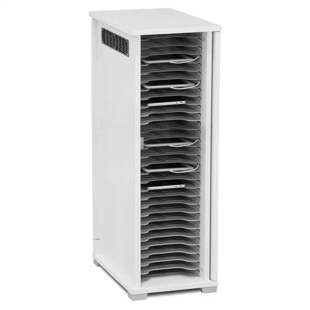 • With individual device compartments that store devices horizontally within a compact footprint.