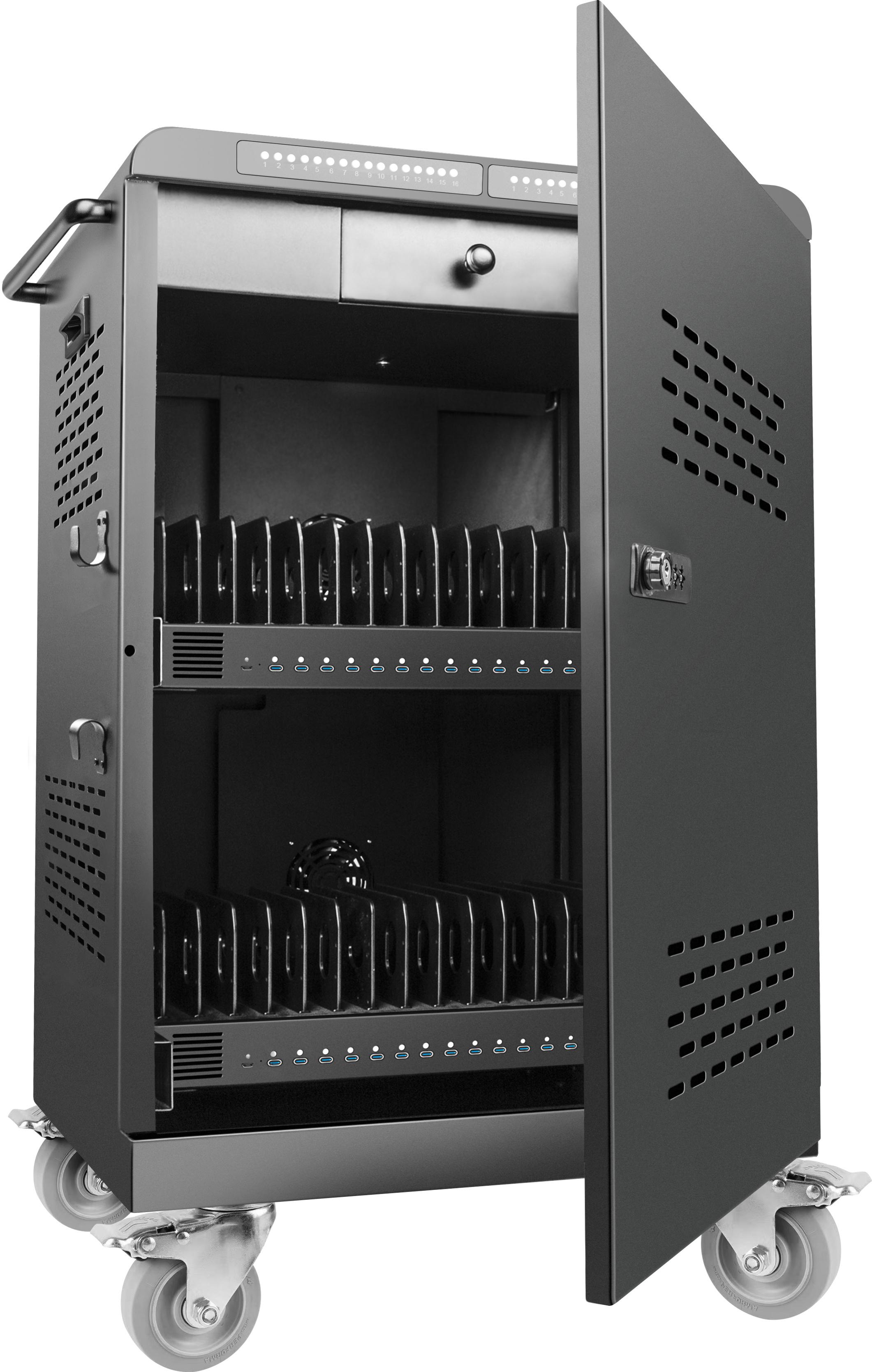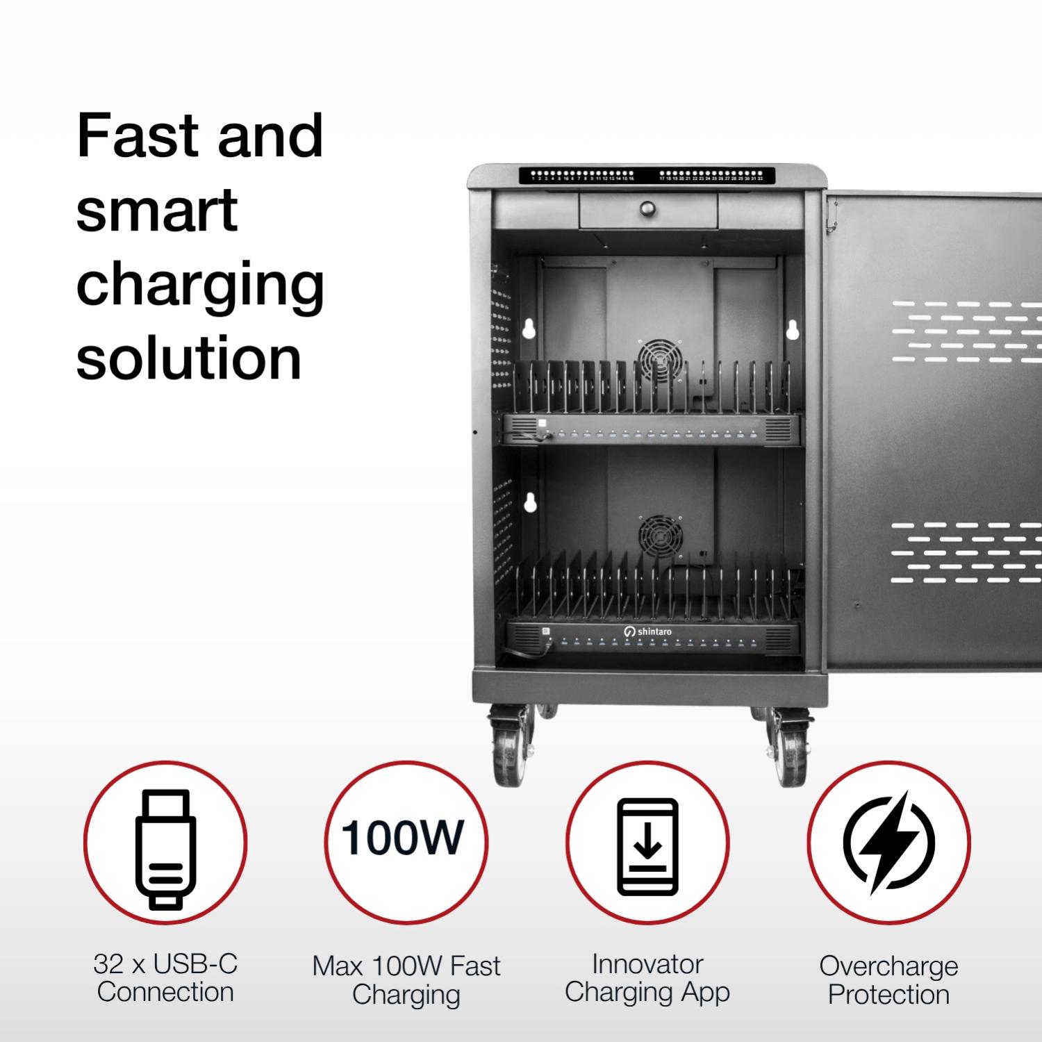 - Charges up to 20 notebooks at 100W or 32 notebooks at 60W simultaneously.