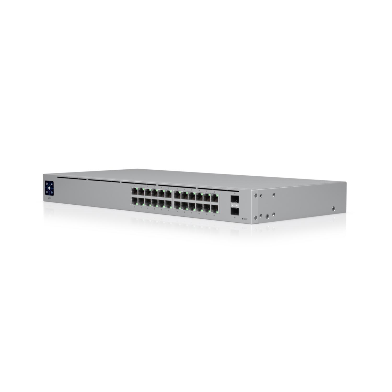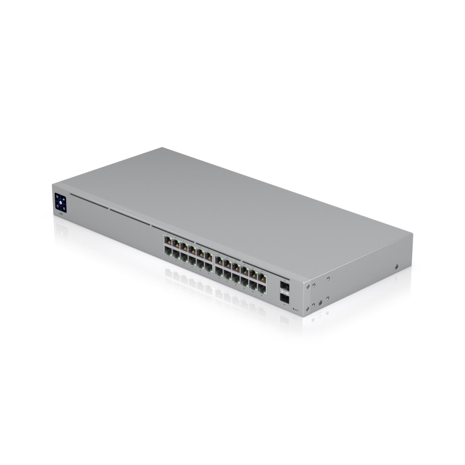 USW-24 is a managed Layer 2 switch with (24) Gigabit Ethernet ports and (2) SFP ports. Its compact 7.9" depth and fanless design allow it to be placed in any workspace, and the 1.3" touchscreen provides current switch states and the necessary information you need for quick diagnosis.