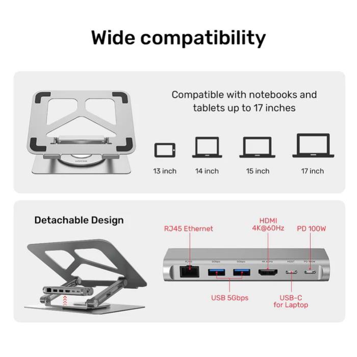 This UNITEK laptop USB-C docking station combines the functions of the laptop dock and laptop stand. Adopting the Magnetic technology, it features a detachable USB-C hub (located at bottom of the stand) which can use on the go.