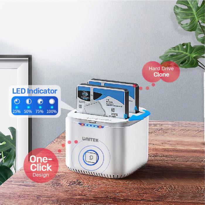 Unitek USB-C to 2.5" Dual SATA 6G Hard Disk Docking Station with Offline Clone, AU 5V2A Power Adapter, White