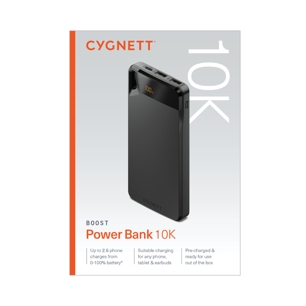 The Cygnett ChargeUp Boost (4th Gen) 10,000mAh Power Bank (model CY4747PBCHE) is a pocket-sized portable charger designed to provide reliable power for smartphones and small electronics on the go. It features a sleek black finish and a digital display to accurately monitor remaining power.