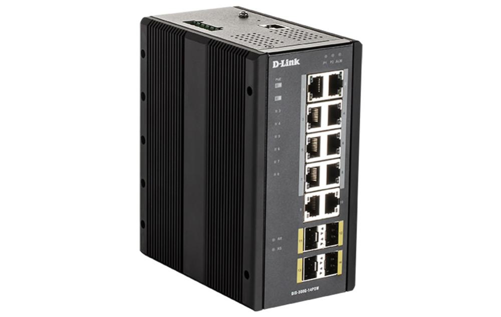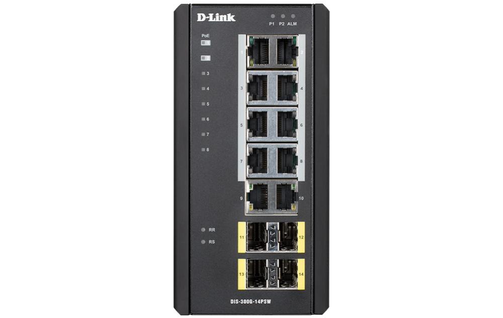 D-Link DIS-300G, 14-Port Industrial Gigabit Managed Switch with 8 BaseT PoE, 2 BaseT and 4 SFP Ports