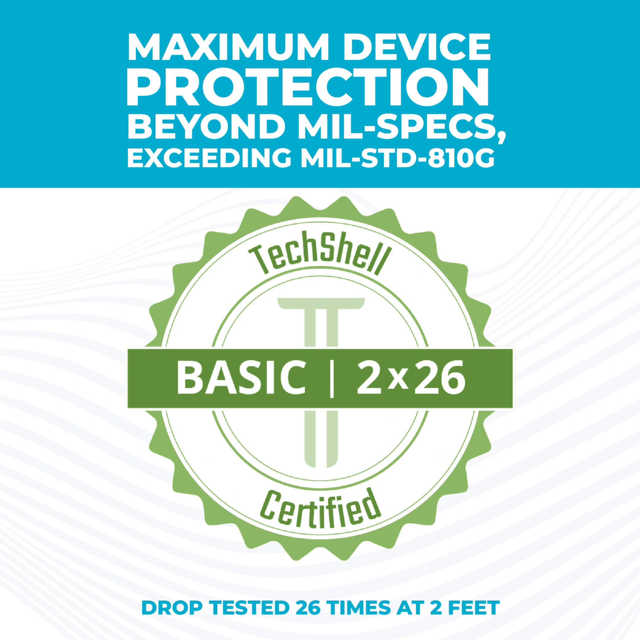 • Best-in-class drop protection against falls up to two (2) feet making the case TechShell Basic Certified, offering additional protection beyond basic mil-specs