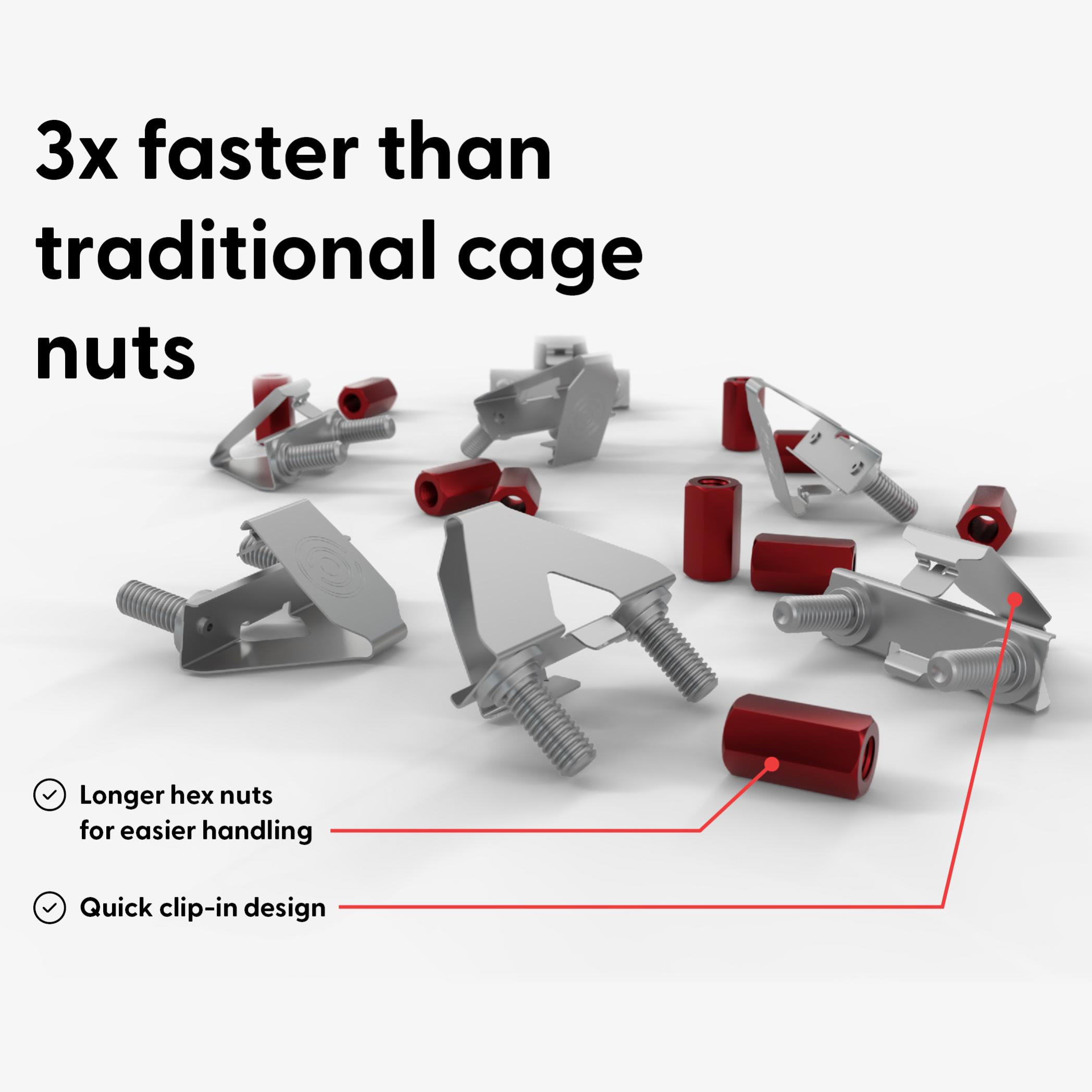 Replace your conventional cage nuts with our easy and pain-free /dev/mount, an innovative cage nut alternative. No tools or prior assembly are required for our /dev/mount and no sharp edges need to be touched. Device mounting has never been easier, faster, and safer before. It is compatible with all 19" rails with square punched holes. With the /dev/mount 50-pack, you can fill up to 25 RU, and it comes with longer hex nuts for easier fastening.