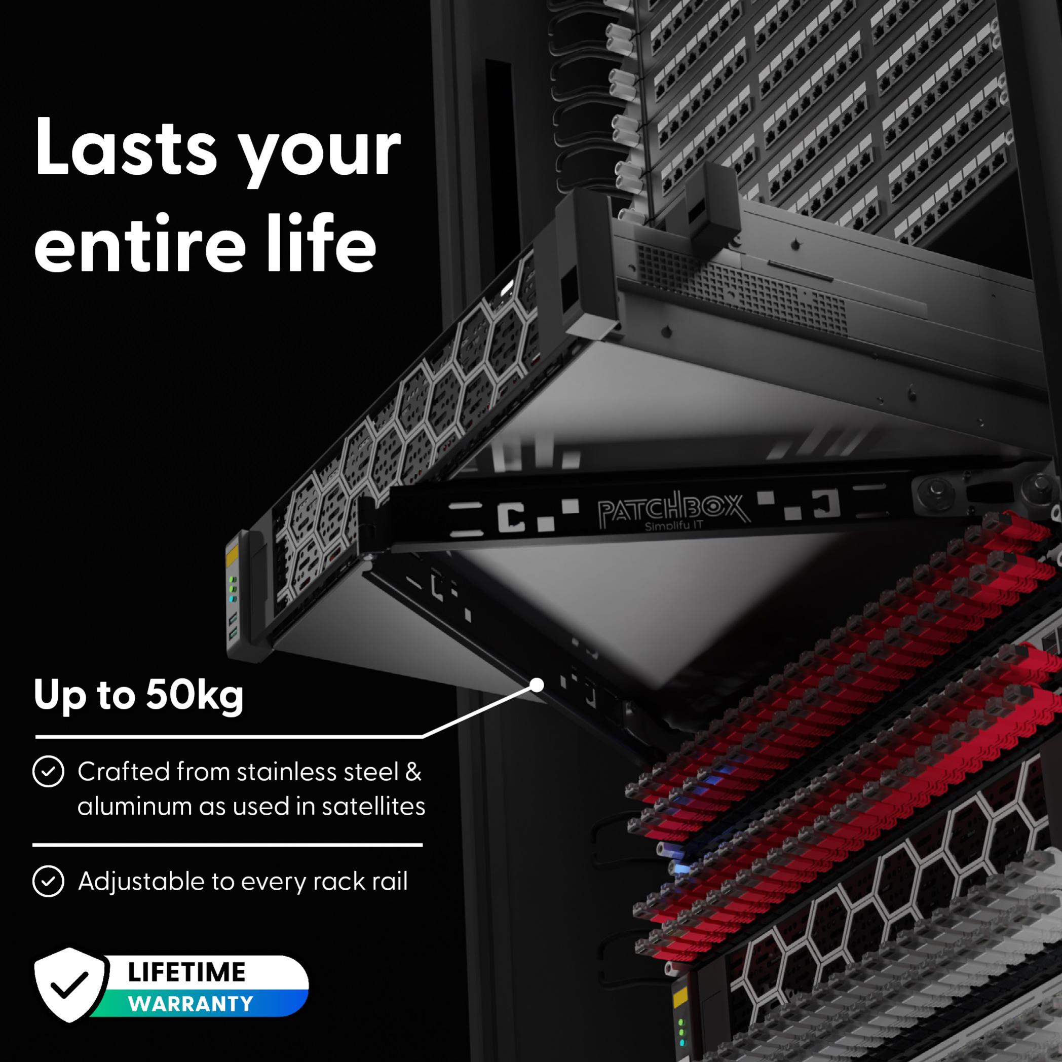 The Setup.exe is a revolutionary installation tool for network racks. Let the Setup.exe hold your heavy equipment with up to 50kg – one side to mount hardware more easily, the other to safely place your laptop. It is installed within seconds without the use of any tools. It comes with adapters for squared and round holes and is compatible with every standard 19" rack. The Setup.exe is covered by a lifetime warranty and is the ideal installation assistant for every IT technician. The Setup.exe will make youget work done faster and easier, without hurting your back.