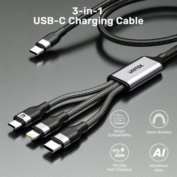 Unitek 1.5M, 3-in-1 USB-C to Lightning, USB-C, Micro USB Multi Charging Cable, PD 20W, Black