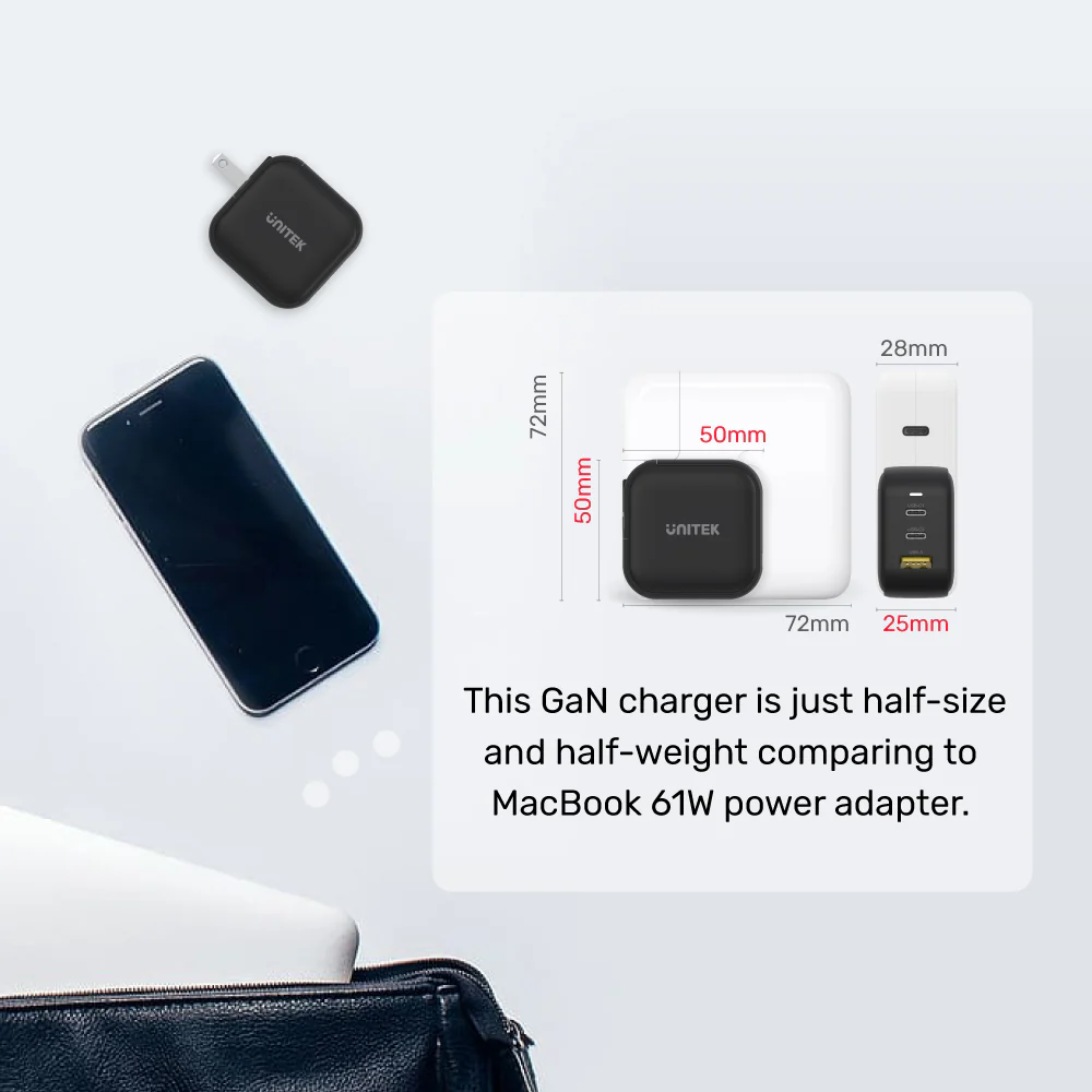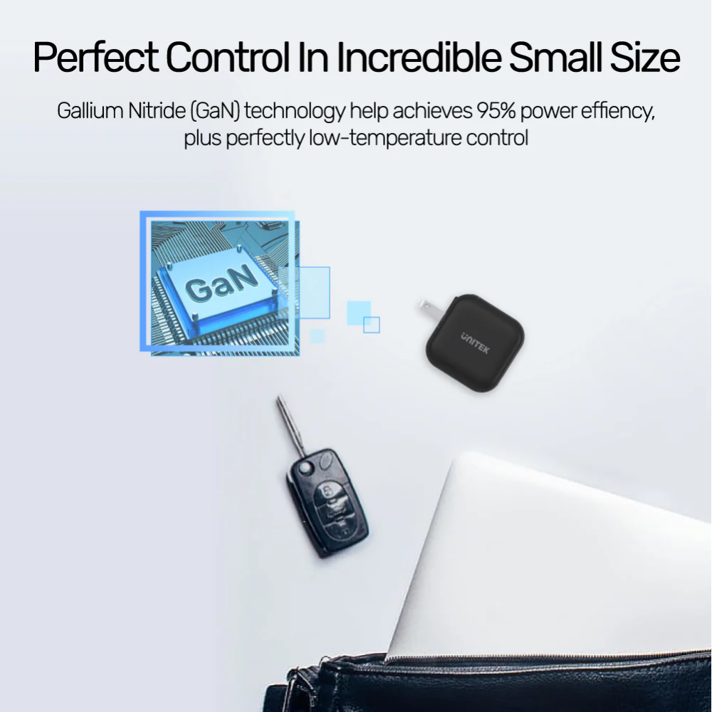 - Powerful GaN(gallium nitride) technology offers super-efficiency at current-transferring with low heat generation which also results in a compact and lightweight design.