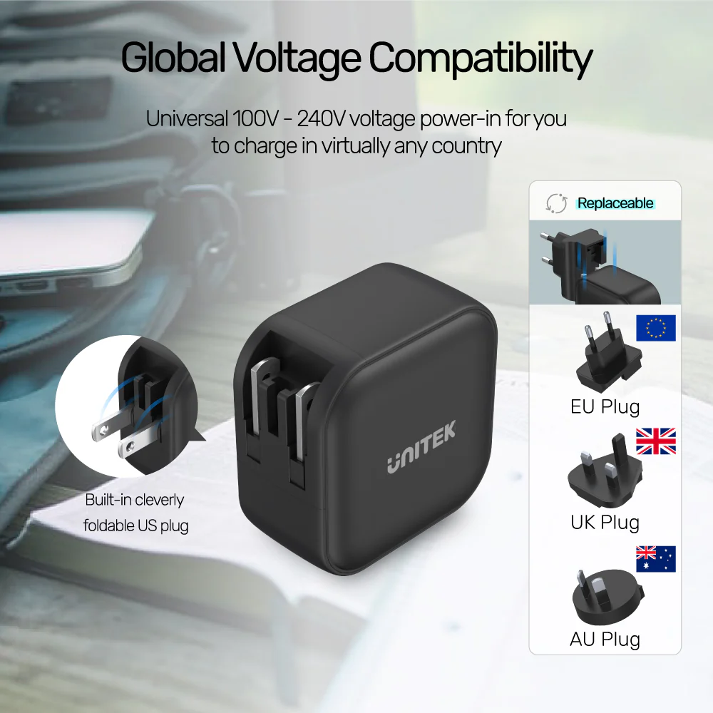 - This travel charger can be applied globally. It equips foldable US plug and comes with EU, UK and AU adapter for replacement and supports the voltage-input under AC 100~240V, 50~60Hz, 1.7A Max.