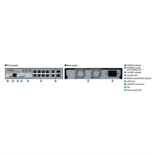 SWR2311P-10G is an intelligent L2 switch that can supply power to PoE powered devices on the network.Yamaha has integrated its own expertise in networking and professional audio fields and developed it as an L2 switch optimized for Dante audio networks.